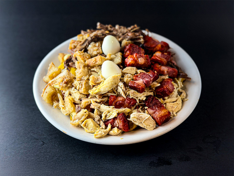 Carne, pollo, Chicharrón, Costilla, Huevos y Doble Queso